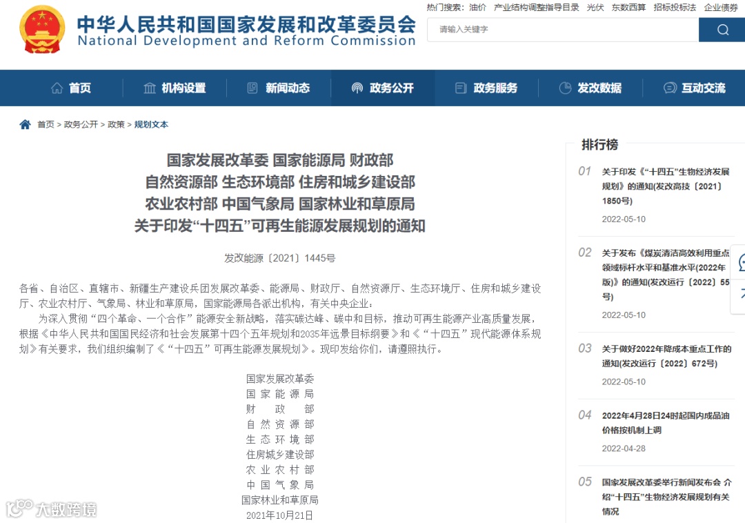 近日,国家发改委、国家能源局、财政部等九部委印发《“十四五”可再生能源发展规划》(以下简称《规划》)。