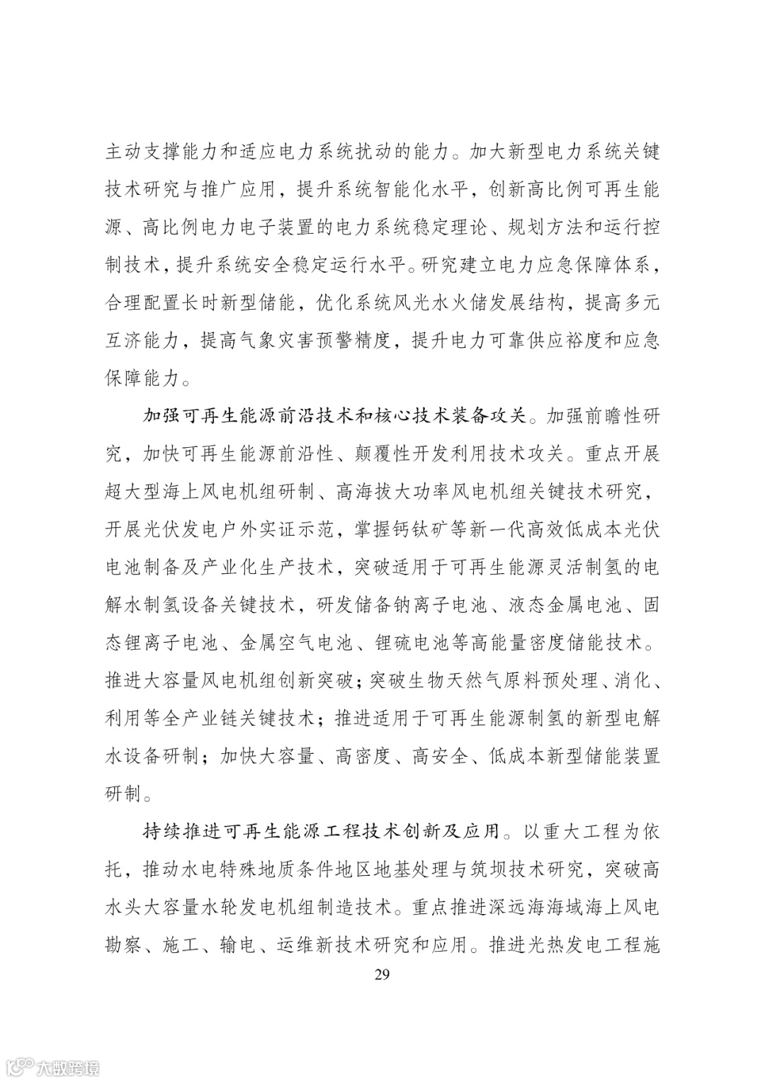 密度储能技术。推进大容量风电机组创新突破;突破生物天然气原料预处理、消化、利用等全产业链关键技术;推进适用于可再生能源制氢的新型电解水设备研制;加快大容量、高密度、高安全、低成本新型储能装置研制。