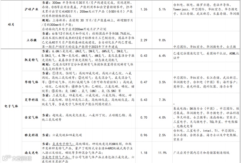 ▲当前部分 A 股半导体材料公司在细分领域的进展及后续规划(研发费用为 2021 年数字,亿元)