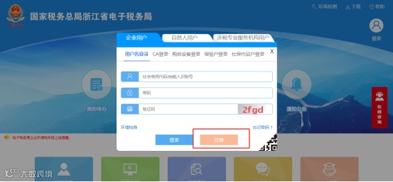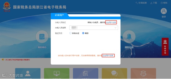 1.若发现下拉框中未出现需要选择的办税员信息需要新增办税员,或者选择密码验证时提示未注册需要注册账号,请点击登录框中“企业用户注册”,进入用户注册及企业绑定界面,如下图所示:
