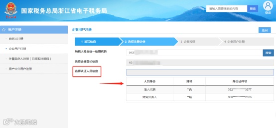 选择登记信息后,“选择认证人员信息”栏会显示该企业的法定代表人及财务负责人的信息,您需要得到“法定代表人”或“财务负责人”的授权方可完成企业绑定。请点击选择人员信息作为下一步的授权人员。如下图所示: