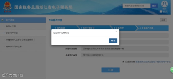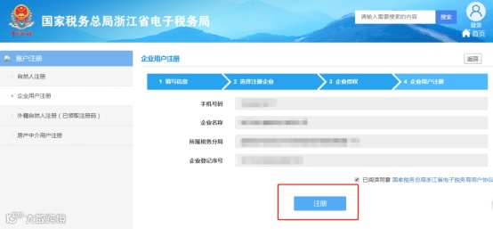 5.授权成功后,进入企业用户注册界面,再次确认企业信息,点击“注册”按钮,如下图所示: