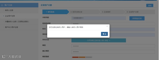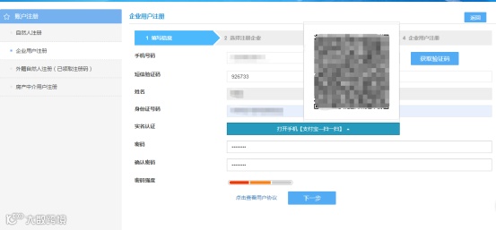 2.未注册的自然人用户,录入必填项,通过支付宝扫码完成实名认证,设置登录密码,如下图所示:
