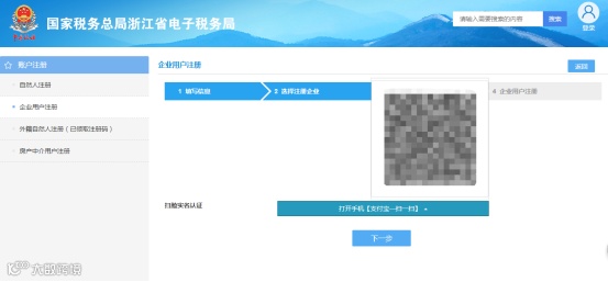4.点击“下一步”,进入企业授权界面,请联系上一步中所选择的认证人员,通过支付宝扫码进行实名认证授权,如下图所示: