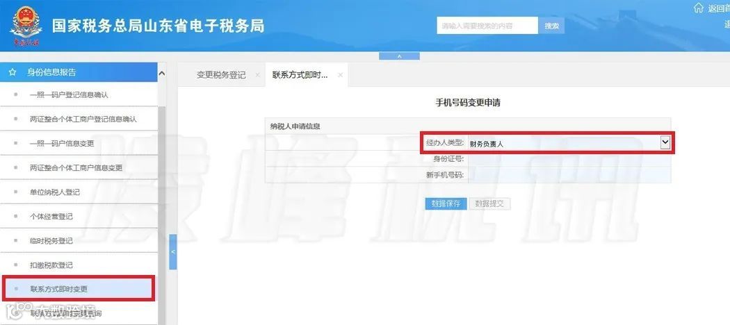如果仅是变更系统内已登记的法人、财务负责人、办税人联系方式,可以点击左侧菜单“身份信息报告”→“联系方式即时变更”,选择相应人员进行手机号码变更。