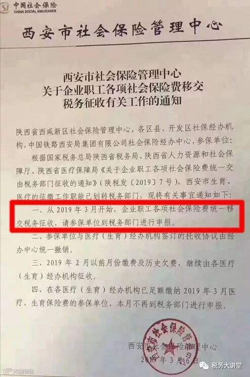 3月6日,一份《西安市社会保险管理中心 关于企业职工各项社会保险费移交税务征收有关工作的通知》流出,显示:2019年3月起,企业职工各项社会保险费统一移交税务征收,参保单位需到税务部门进行申报!