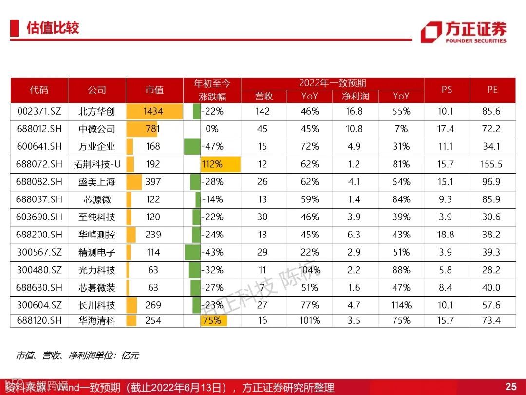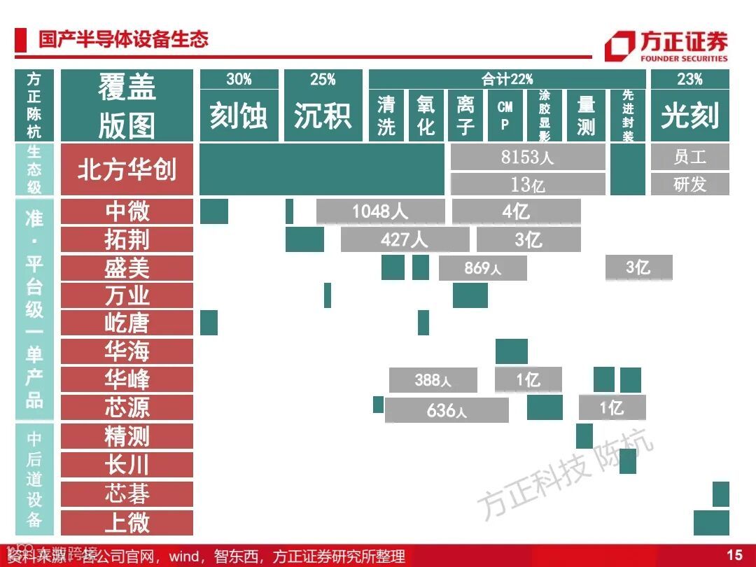 1)半导体设备:北方华创、拓荆科技、华海清科、中微公司、盛美半导体、万业企业、芯源微、屹唐公司(待上市)、光力科技、华卓精科(待上市)、精测电子;