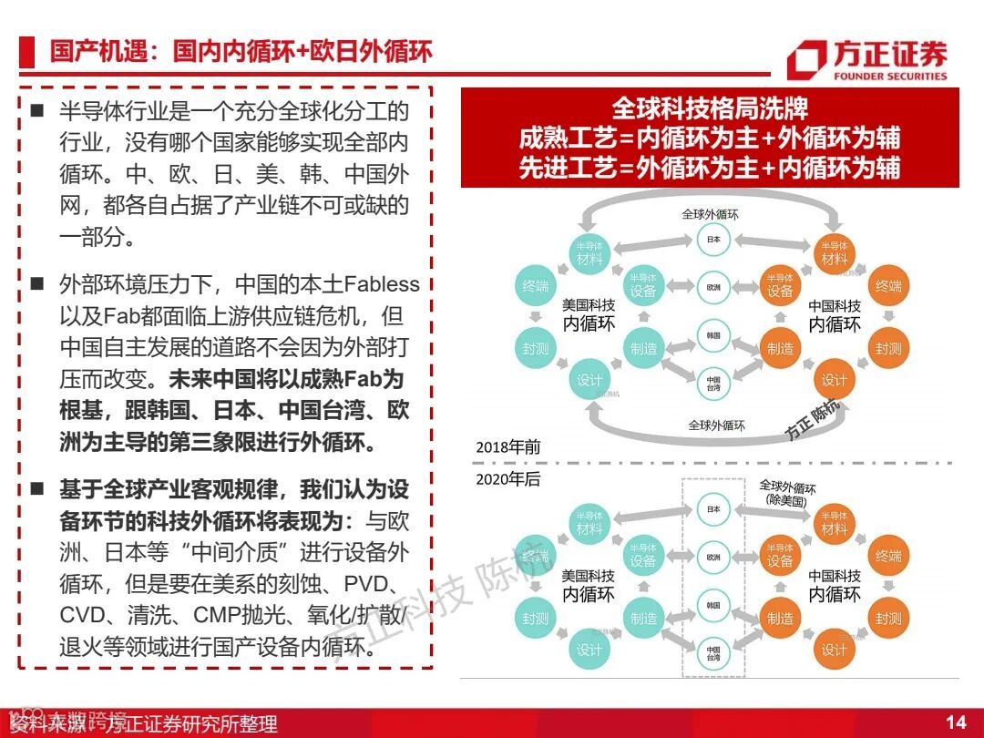 3、国产3.0:2020年12月,中芯国际进入实体名单,限制的是芯片上游半导体供应链,本质是卡住芯片上游设备。想要实现供应链安全,必须做到对半导体设备和半导体材料的逐步突破,由于DUV不受美国管辖,此阶段的关键是针对刻蚀等美系技术的替代。