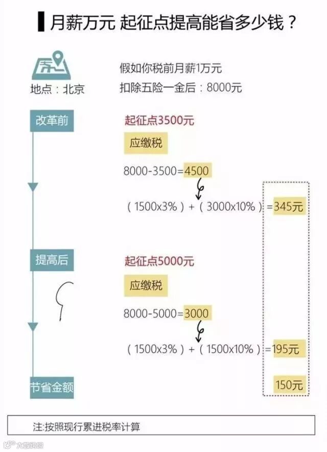 个税起征点由每月3500元提高至每月5000元(每年6万元);
