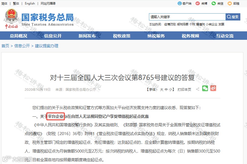1、平台经济中的自然人能否享受月销售额10万元(季度销售额30万元)以下免征增值税的优惠,主要看是否做了税务登记。