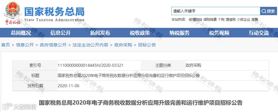 国家税务总局的网站上发布了“2020年电子商务税收数据分析应用升级完善和运行维护项目”招标公告。