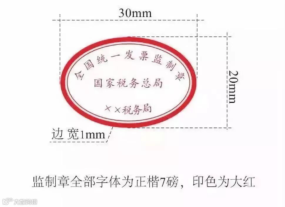 新启用的发票监制章形状为椭圆型,长轴为3厘米,短轴为2厘米,边宽为0.1厘米,内环加刻一细线,上环刻制“全国统一发票监制章”字样,中间刻制“国家税务总局”字样,下环刻制“××省(区、市)税务局”字样,下环字样例如:“湖北省税务局”、“武汉市税务局”、“内蒙古自治区税务局”、“新疆维吾尔自治区税务局”。字体为楷体7磅,印色为大红色。