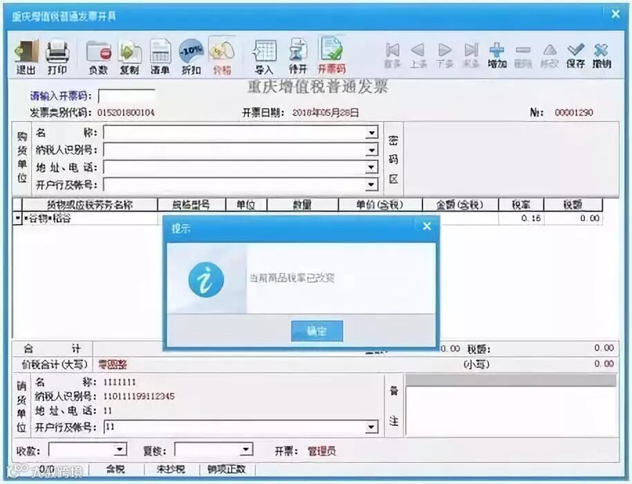 a)发票填开页面,当选择的商品编码税率与编码库中税率不一致时,提示“当前商品税率已改变”,来提醒用户税率已发生变化。