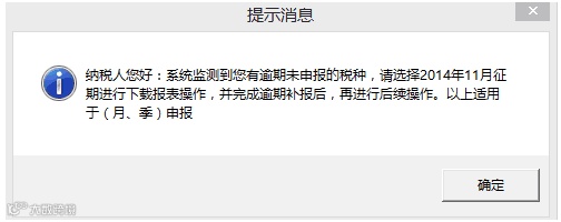 解决方法:软件弹出这个提示信息说明纳税人往期有逾期未申报情况。请点击“确定”按钮后,选择要补充申报的征期,进入申报模块完成填表申报。
