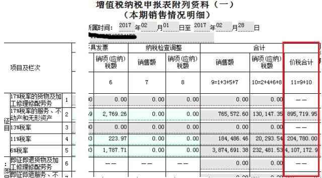 解决方法:调整“营改增税负测算明细表”第1列“不含税销售额”,使第3列“价税合计”与“增值税纳税申报表附列资料(一)”的第11列“价税合计”合计数据(11列合计数据为:附表一第11列的2行、4行、5行、9b行、12行、13a行、13b行、13c行之和)数据值保持一致。