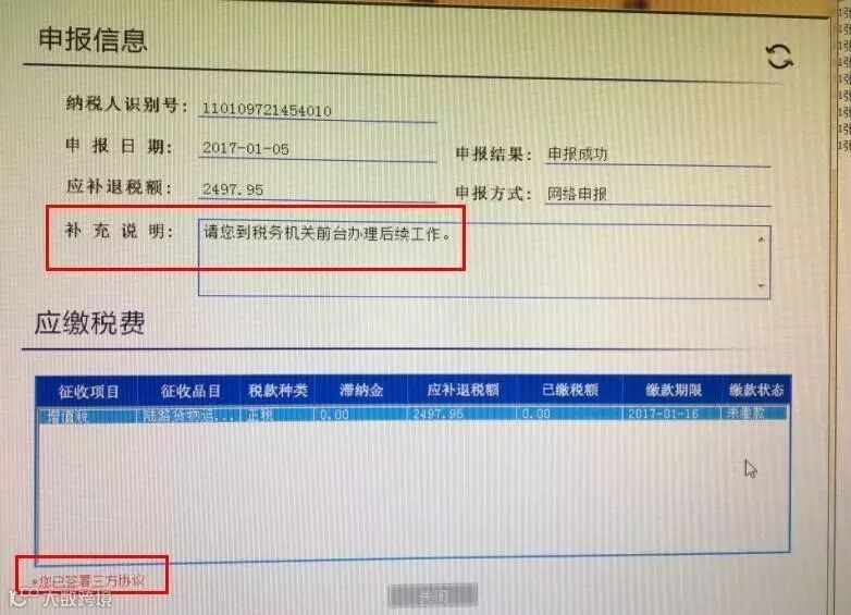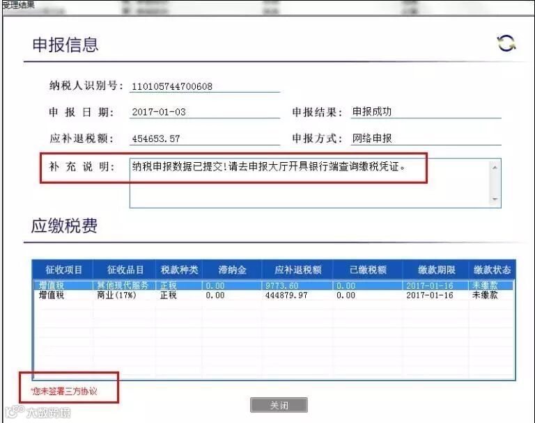 问题原因:自2017年1月征期开始由于金三系统后台调整,申报成功后的扣款界面有所更新,点击受理结果会出现申报信息界面,可以选择打印缴款凭证或者在线扣款;无扣款提示的申报信息中会有补充说明,可根据补充说明提示的信息判断用户需要如何处理;