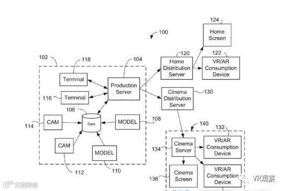 【华纳兄弟新专利申请展望了VR时代的影院蓝图】华纳兄弟去年十月向美国专利及商标局提交了一份完整的 VR、AR 观影系统的专利,从服务器端到消费者头显终端,再到传输方式,几乎完全绘制了一个 VR、AR 时代的电影院蓝图。华纳兄弟对这套系统的简介如下:一套为普通荧幕(例如:电影荧幕)和个人沉浸式设备提供数据的娱乐系统。例如:影音数据存储服务器与多个沉浸式输出设备(例如:VR 输出设备)的数字信号沟通。服务器配置的数字信号可同时传输到多个沉浸式输出设备。