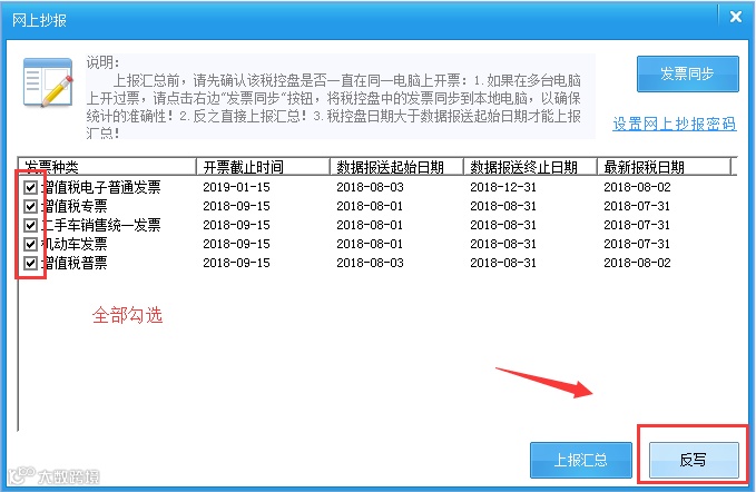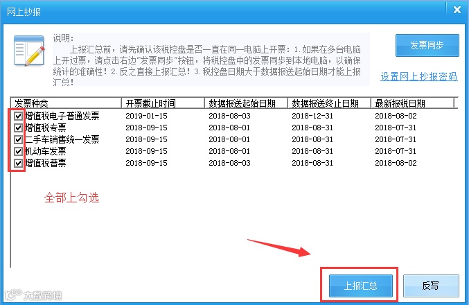 ★点击软件模块【报税处理】--【网上抄报】--【一键上报汇总】