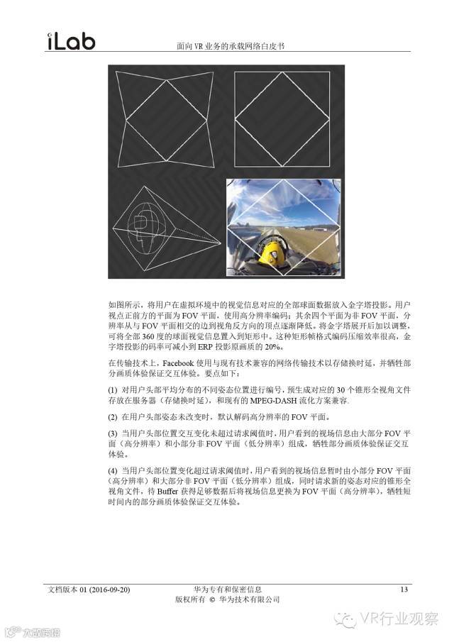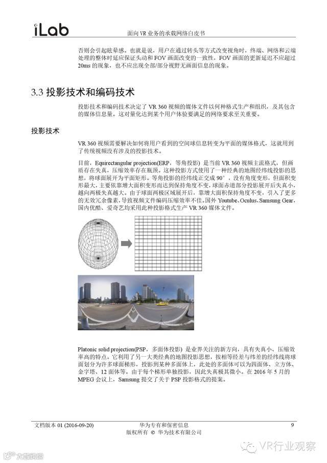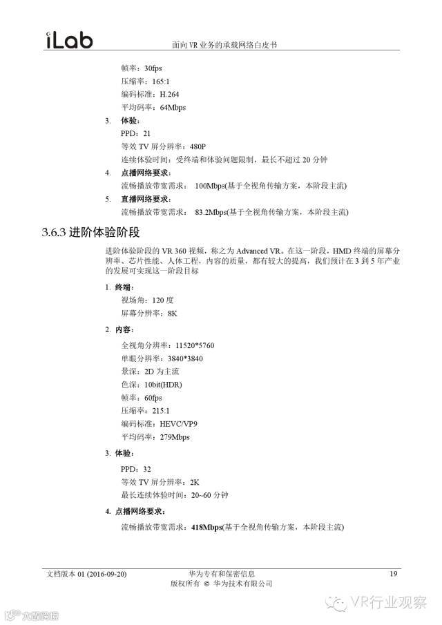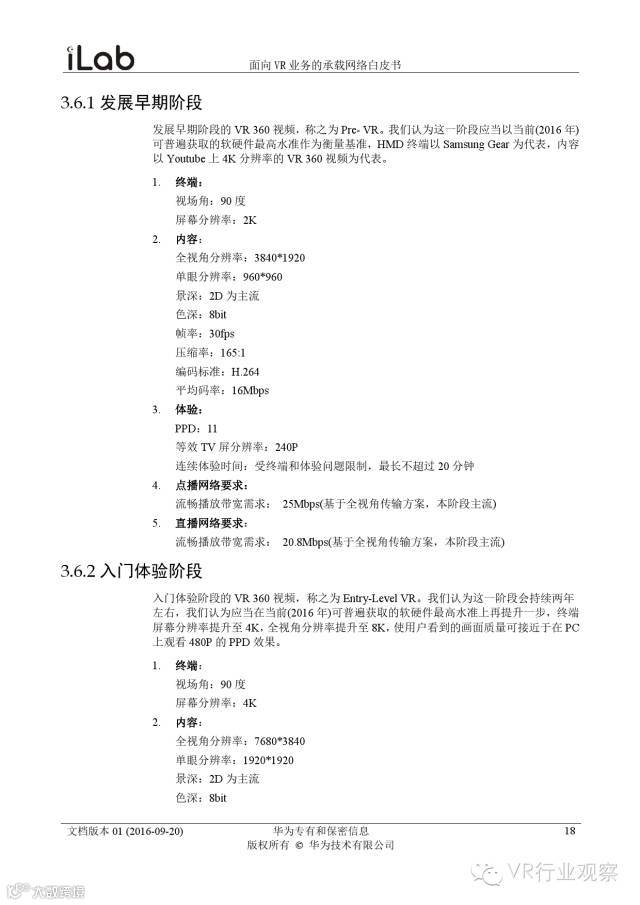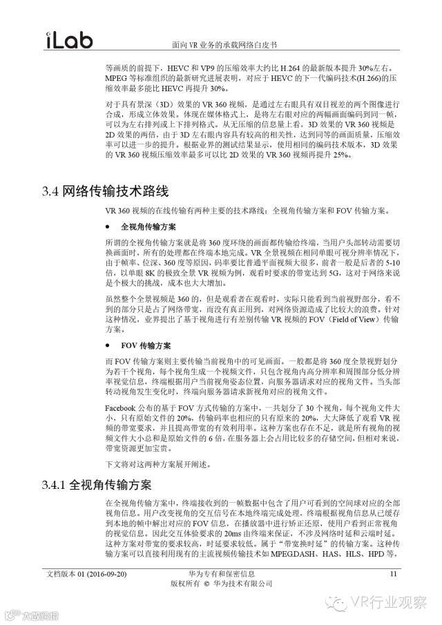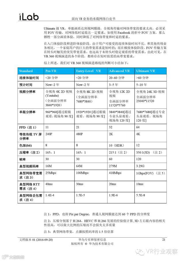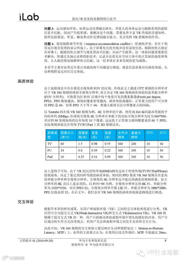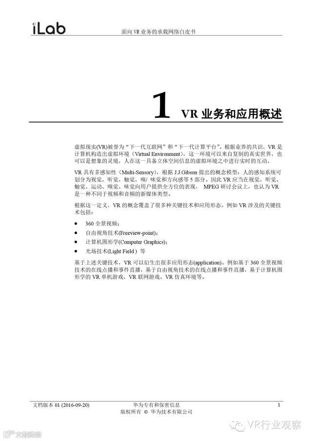 观察君说 对当前的VR行业来说,一切都处于起步的阶段。由于VR的沉浸性终端拥有远高于传统终端的视场角,全视角4K分辨率远不能达到满意的视频质量。此外,目前广泛应用的投影技术、编码技术、网络传输技术等,都有极大的提升和进步空间。如果你对于VR行业有所兴趣,这篇由华为iLab发布的《2016年面向VR业务承载网络需求白皮书》或许能让你对当前VR行业的各类技术有个全面的了解,以下为白皮书全文——