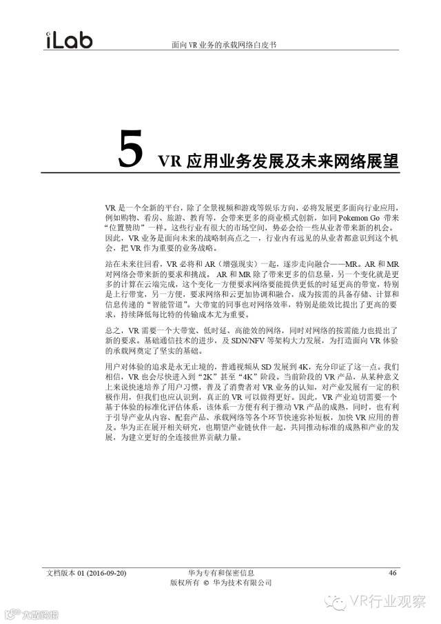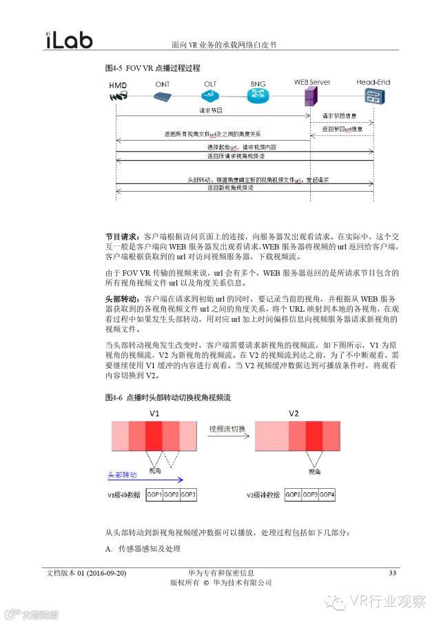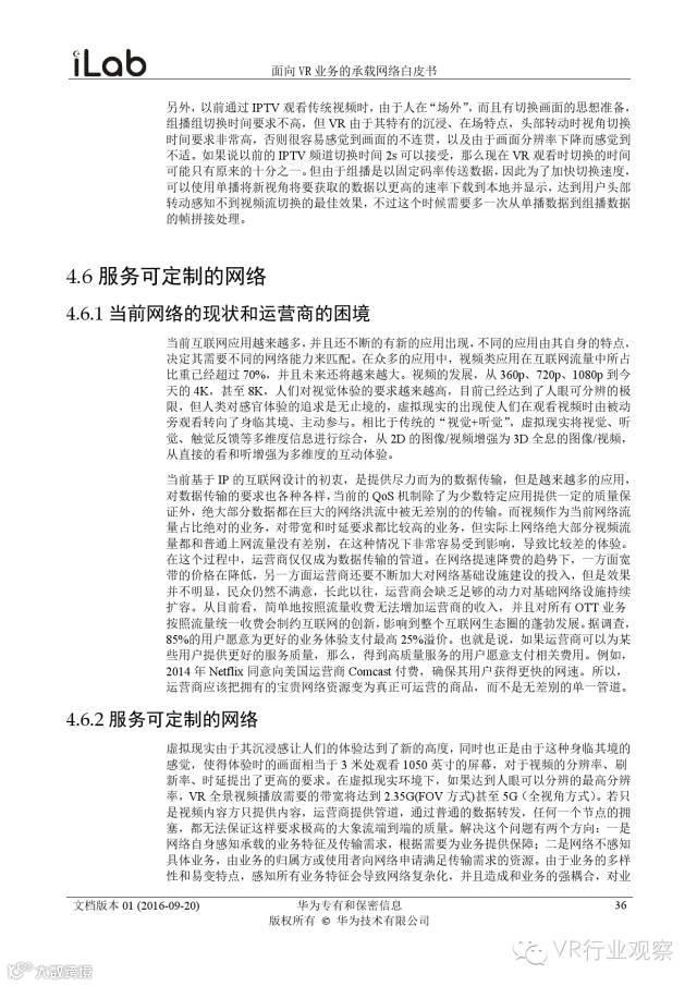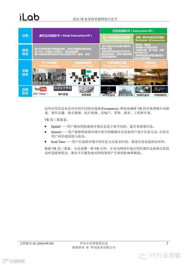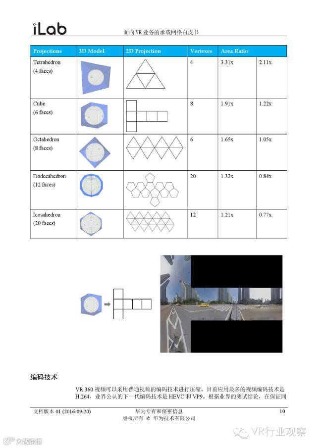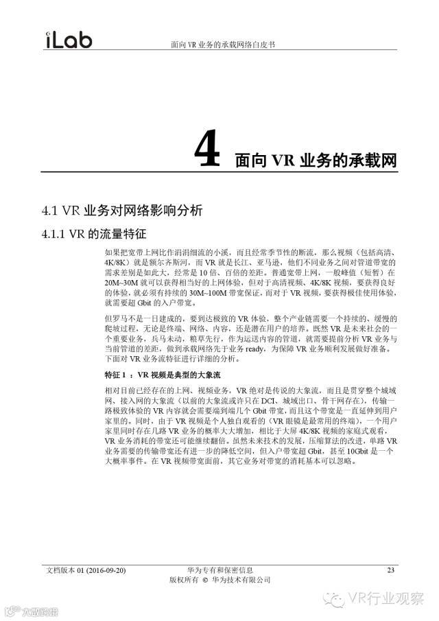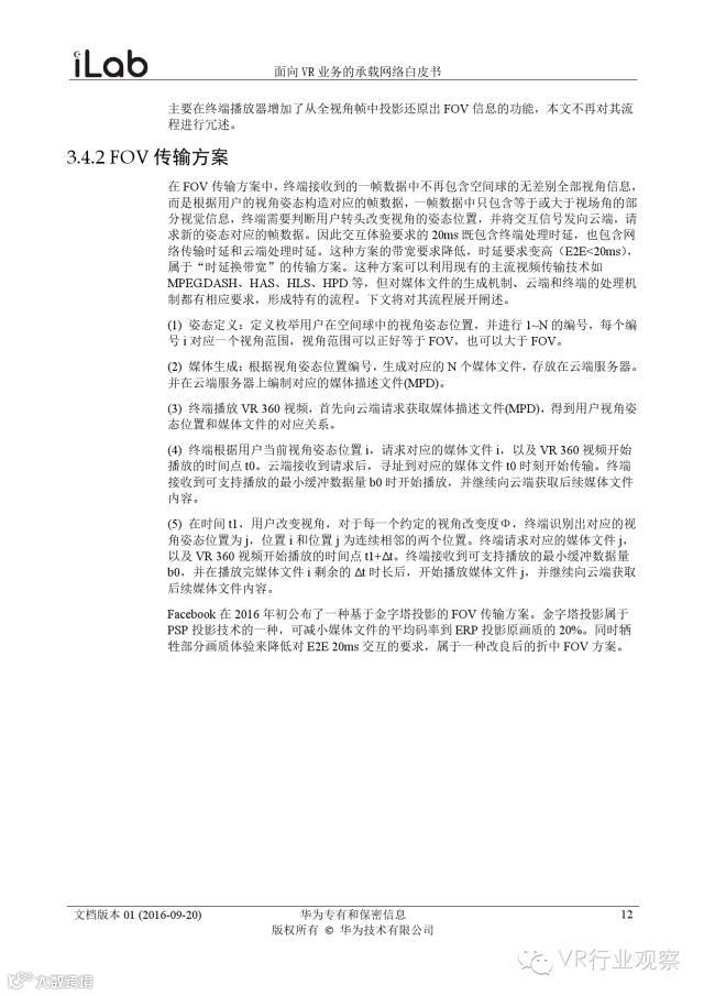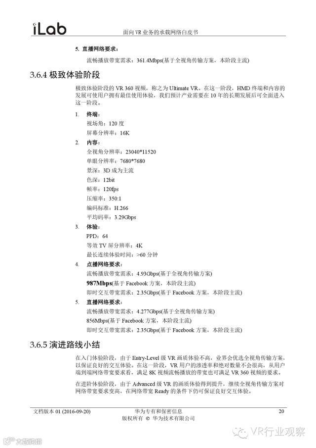 观察君说 对当前的VR行业来说,一切都处于起步的阶段。由于VR的沉浸性终端拥有远高于传统终端的视场角,全视角4K分辨率远不能达到满意的视频质量。此外,目前广泛应用的投影技术、编码技术、网络传输技术等,都有极大的提升和进步空间。如果你对于VR行业有所兴趣,这篇由华为iLab发布的《2016年面向VR业务承载网络需求白皮书》或许能让你对当前VR行业的各类技术有个全面的了解,以下为白皮书全文——
