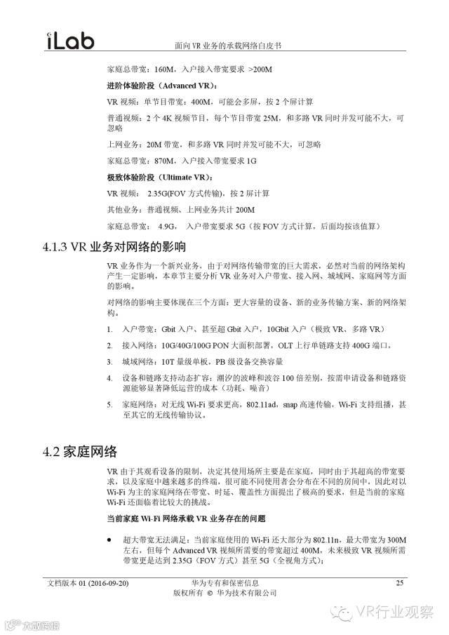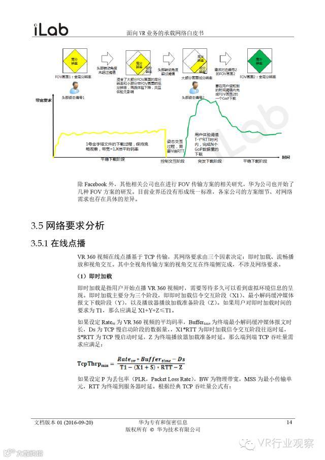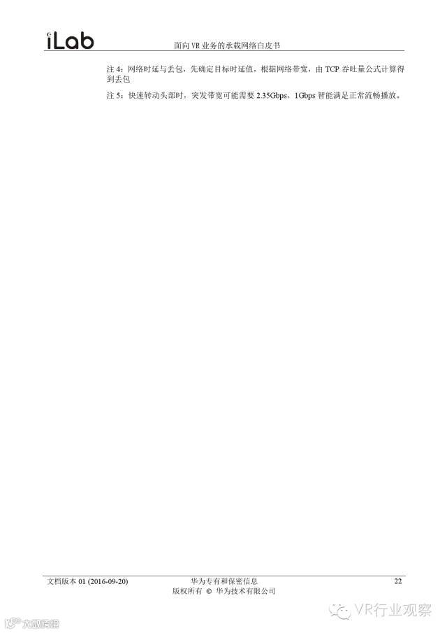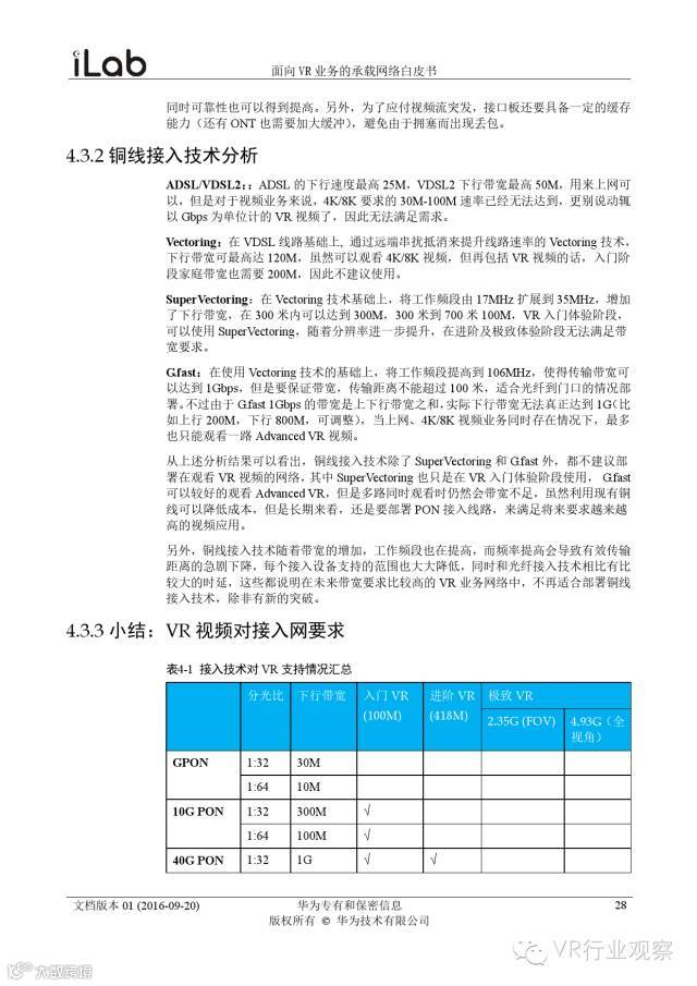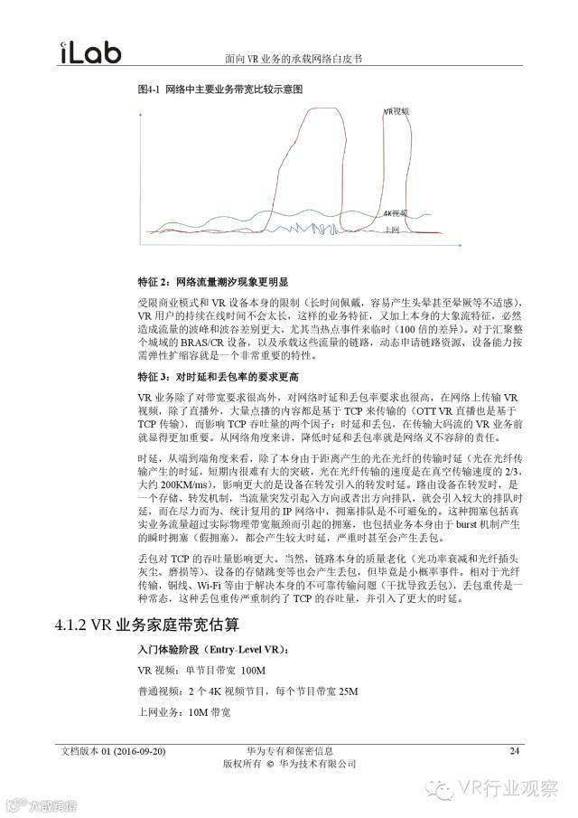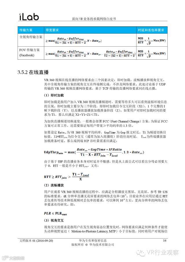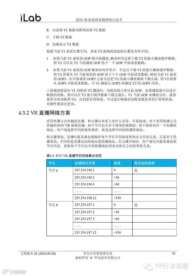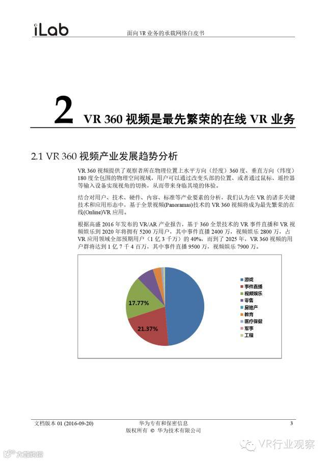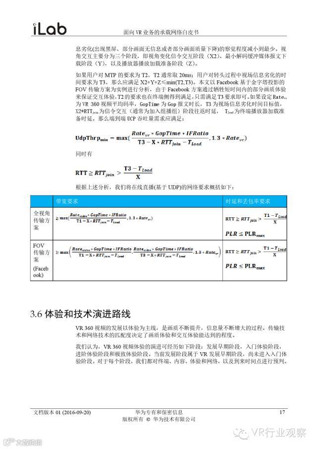 观察君说 对当前的VR行业来说,一切都处于起步的阶段。由于VR的沉浸性终端拥有远高于传统终端的视场角,全视角4K分辨率远不能达到满意的视频质量。此外,目前广泛应用的投影技术、编码技术、网络传输技术等,都有极大的提升和进步空间。如果你对于VR行业有所兴趣,这篇由华为iLab发布的《2016年面向VR业务承载网络需求白皮书》或许能让你对当前VR行业的各类技术有个全面的了解,以下为白皮书全文——