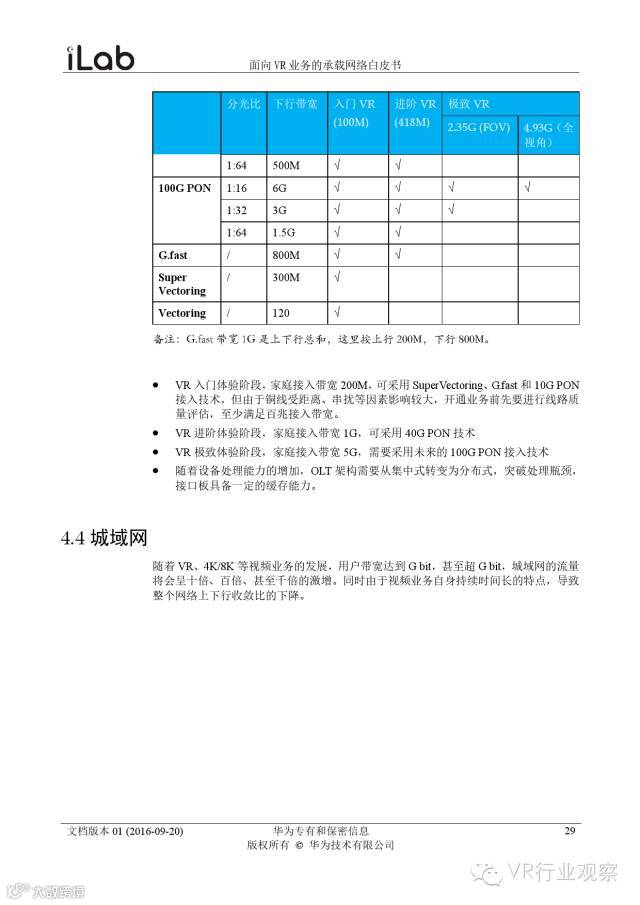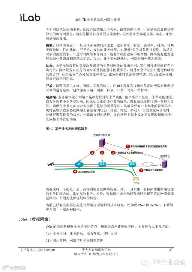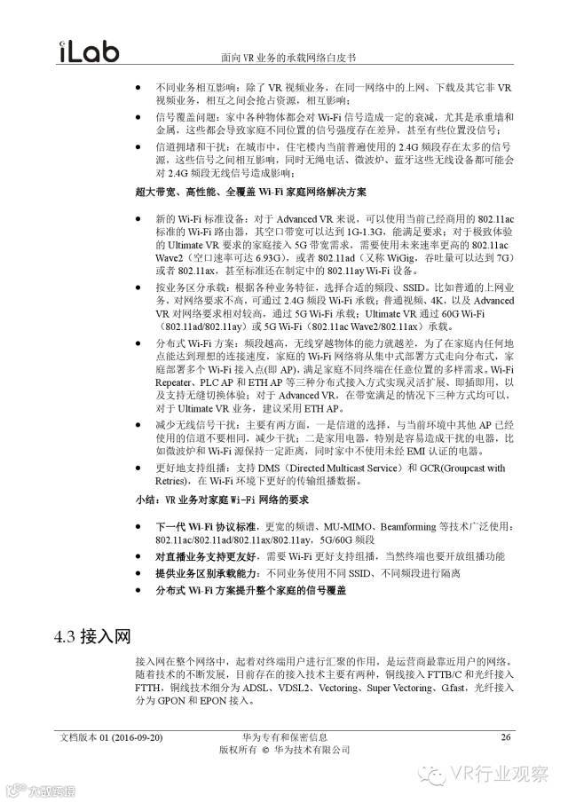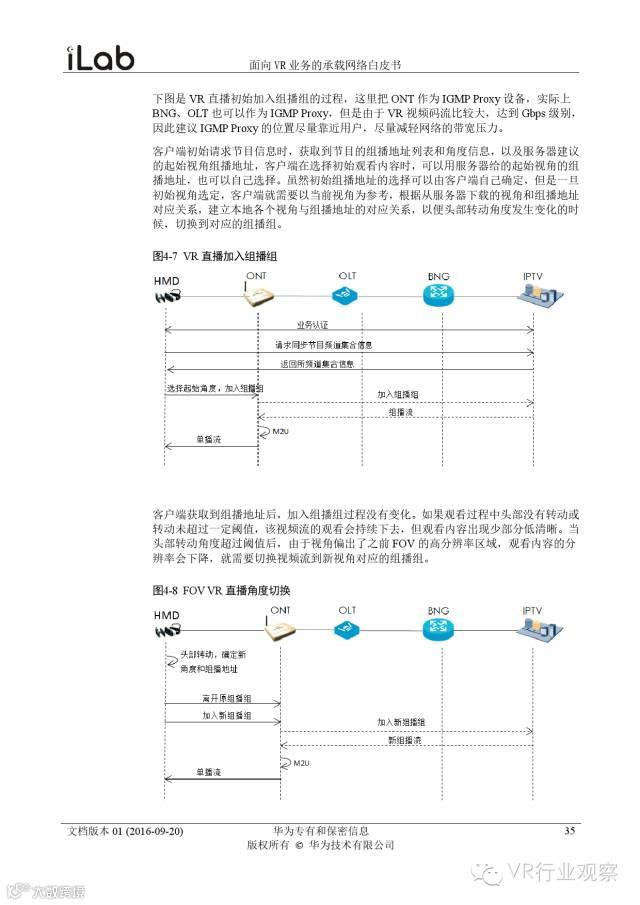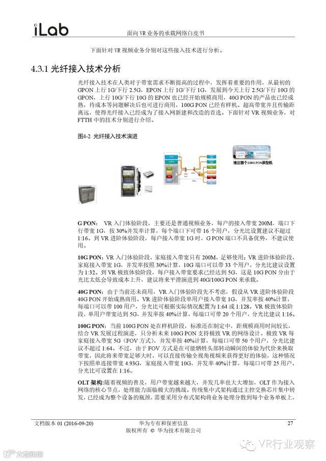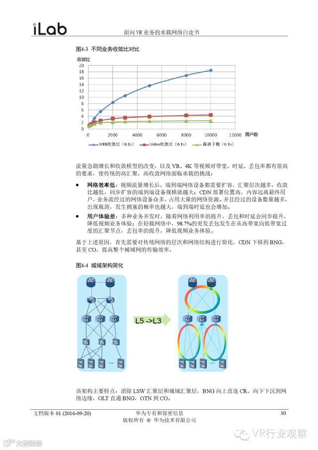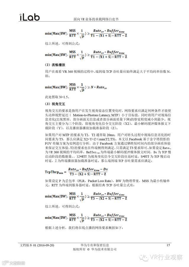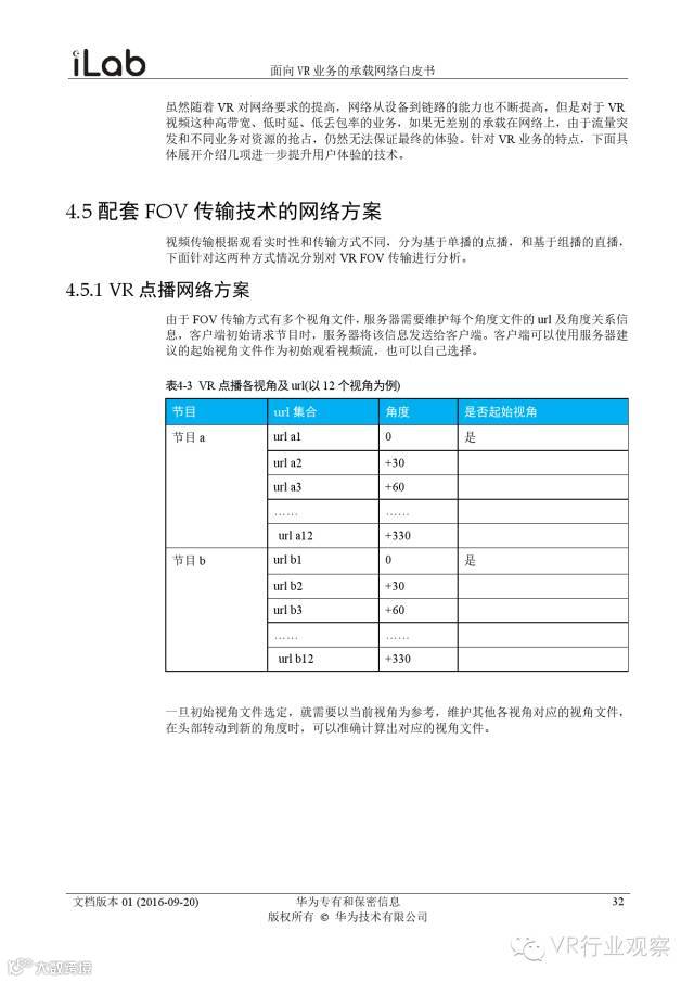 观察君说 对当前的VR行业来说,一切都处于起步的阶段。由于VR的沉浸性终端拥有远高于传统终端的视场角,全视角4K分辨率远不能达到满意的视频质量。此外,目前广泛应用的投影技术、编码技术、网络传输技术等,都有极大的提升和进步空间。如果你对于VR行业有所兴趣,这篇由华为iLab发布的《2016年面向VR业务承载网络需求白皮书》或许能让你对当前VR行业的各类技术有个全面的了解,以下为白皮书全文——