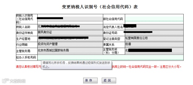 如一证通已变更为新税号则新社会信用代码自动带出,否则手动添加(一定要确保录入的社会信用代码与新的营业执照上的社会信用代码保持一致,一定注意区分大小写,注意不要有空格)填写经办人手机号码(仅限北京手机号码,业务受理完成后会将结果用短信的方式反馈给您),保存。
