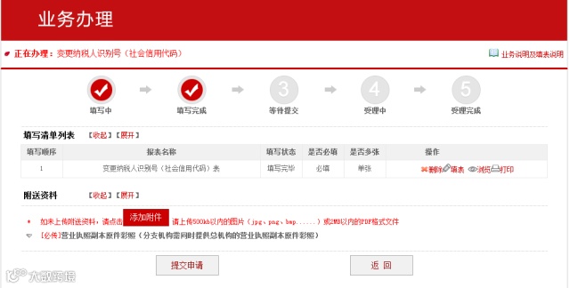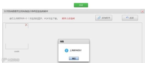 点击“添加附件”上传附件(注意:一定要上传新的营业执照副本原件彩照,分支机构需要同时上传总机构的营业执照副本原件彩照)