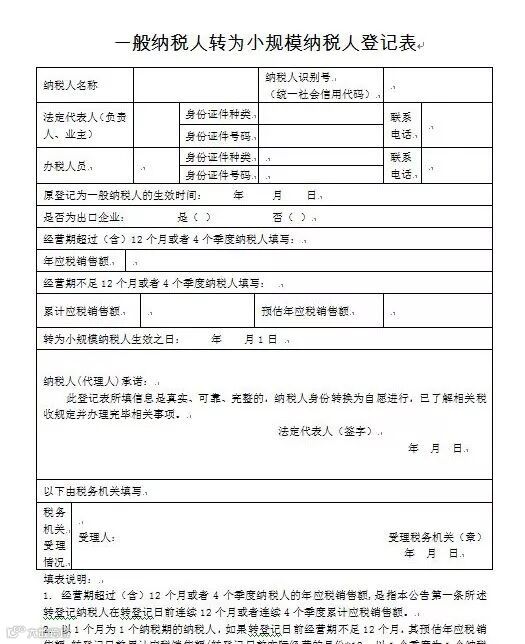 向主管税务机关填报《一般纳税人转为小规模纳税人登记表》(表样见下图),并提供税务登记证件;已实行实名办税的纳税人,无需提供税务登记证件。