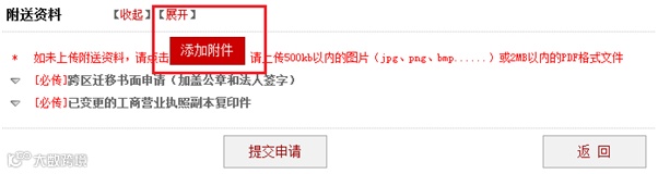 企业用户点击“添加附件”上传资料,上传完成勾选后点击提交。