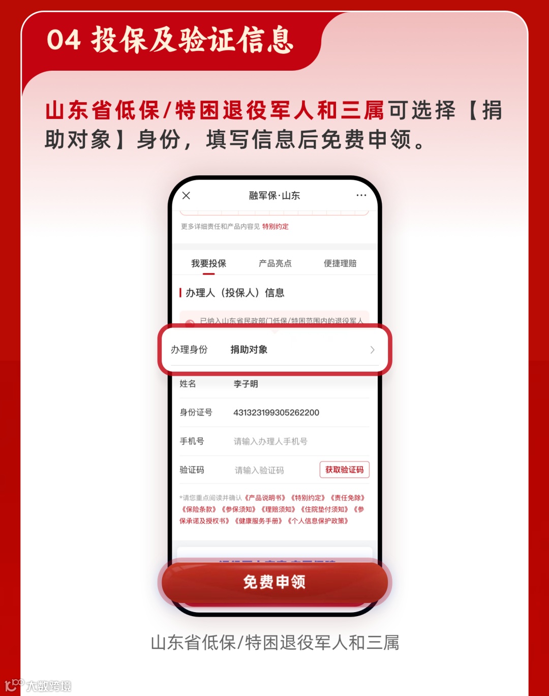 “融军保·山东”作为现退役军人家庭专属普惠型补充医疗保障,坚持为军惠军,本次发布会上,中国退役军人关爱基金会为符合“特困人员、低保户”标准的山东省退役军人、烈士遗属、因公牺牲军人遗属及病故军人遗属捐赠了“融军保·山东”产品,符合条件人员免费申领保障!