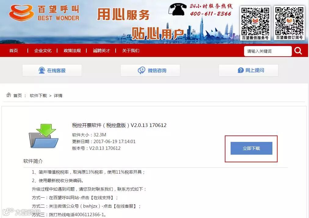 登录www.bwhj.cn网站,鼠标滑动至软件下载,点击首条:【税控开票软件(税控盘版)V2.0.13 170612】进行下载: