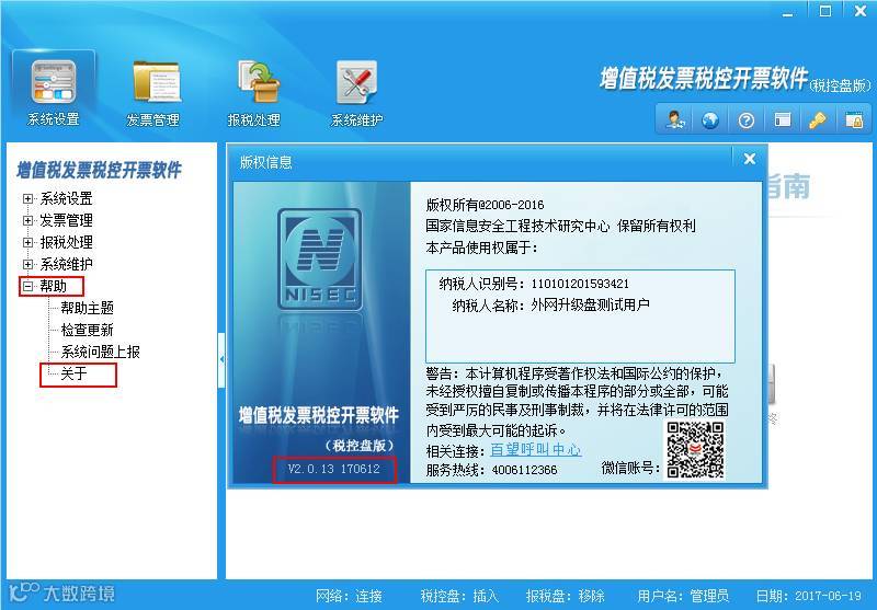 4、检查软件升级结果,打开开票软件,点击“帮助”菜单下的“关于”页面,出现以下界面说明升级成功: