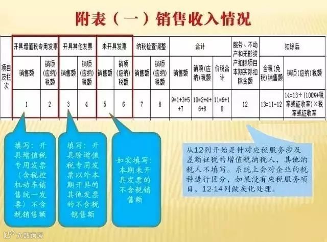 步骤二、填写附表(一):销售收入情况。部分栏次对纯货物劳务类纳税人开放;部分栏次对纯服务、不动产、无形资产类纳税人开放;兼营纳税人相关行次都会放开。第11、12列的数据与附表三差额征税会勾稽。差额征税启用白名单管理,如果没有向主管税务所报送过,将无法填写差额征税栏次。