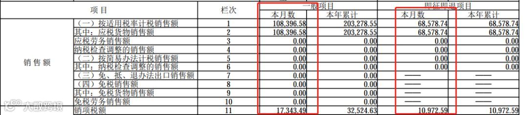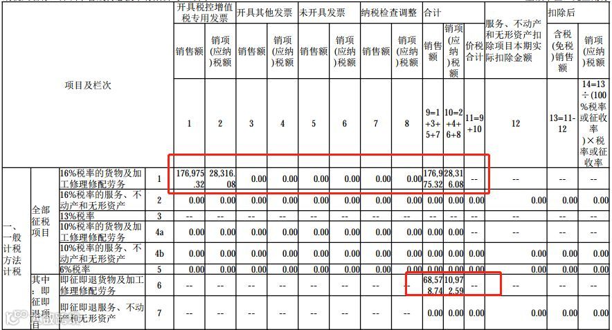 附表1填写完成后,主表会自动将一般项目和即征即退项目的销售额和销项税分别列示。如图