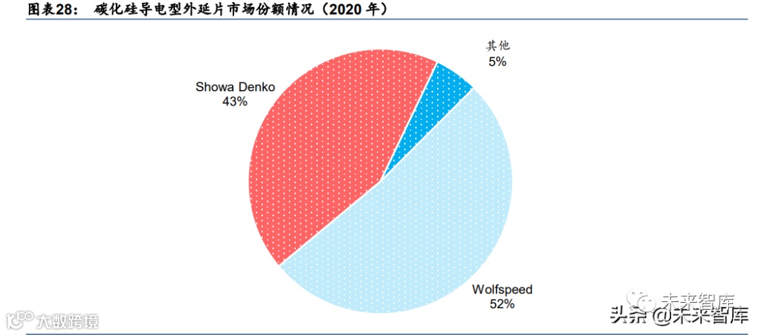 Wolfspeed、Showa Denko 双寡头垄断碳化硅外延片市场。碳化硅外延片属于行业产业链 中间环节,参与厂商多为 IDM 公司,Industry Research 测算 2020 年全球碳化硅外延片市 场规模约为 1.72 亿美元。据 Yole 数据,2020 年 Wolfspeed 与 Showa Denko 分别占据碳 化硅导电型外延片市场52%和43%的市场份额,合计高达95%,具备显著的制备技术优势。其他碳化硅外延供应商包括Ⅱ-Ⅵ、Norstel、罗姆、三菱电机、英飞凌,占据市场较小份额。国内碳化硅外延片主要制造厂商有瀚天天成和