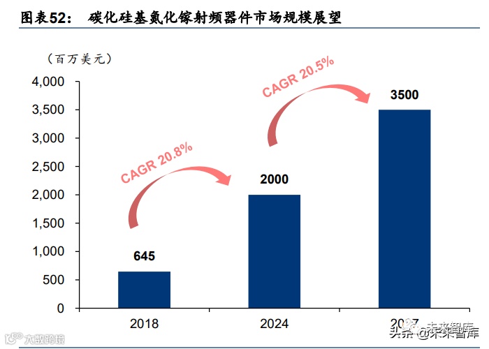 据 Yole 和 Wolfspeed 预测,2024年碳化硅基氮化镓功率器件市场有望突破 20 亿美元,2027 年进一步增长至 35 亿美元。根据我们的预测,受益 5G 通讯快速发展, 通讯频段向高频迁移,基站和通信设备需要支持高频性能的 PA,碳化硅基氮化镓射频器件 相比硅基 LDMOS 和 GaAs 的优势将逐步凸显,我们测算 2020年全球碳化硅射频器件市场 规模为 8.92 亿美元,预计到 2025 年将增长至 21.21 亿美元,对应 CAGR 为 18.9%,和 Yole 和 Wolfspeed 预测基本一致。