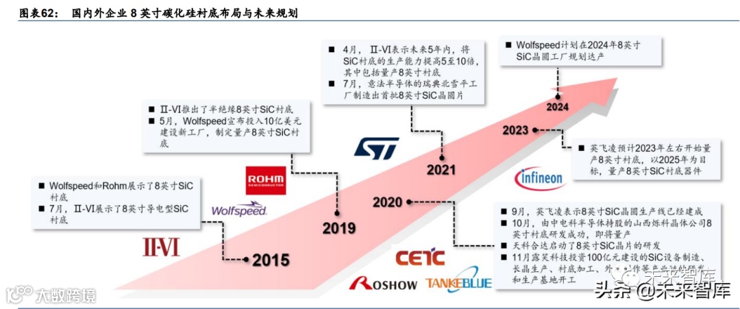 Norstel,开始布局 SiC 衬底及外延;II-VI 公司在 2020 年收购 Ascatron、INNOViON 以及 GE 的 SiC IP 授权,进一步垂直整合 SiC 业务。(2)国内厂商方面,三安光电宣布投 资 160 亿元建设湖南三安半导体项目,将打造国内首条、全球第三条碳化硅垂直整合产业 链,该产线可月产 3 万片 6 英寸碳化硅晶圆。同时,碳化硅衬底、器件厂商往往与汽车等 设备制造商签订长期合作协议,加强产业链上下游协同。我们认为未来进入行业整合阶段, 头部厂商将积极进行产业链上下游延伸,以提升全产业链竞争力和市占率。