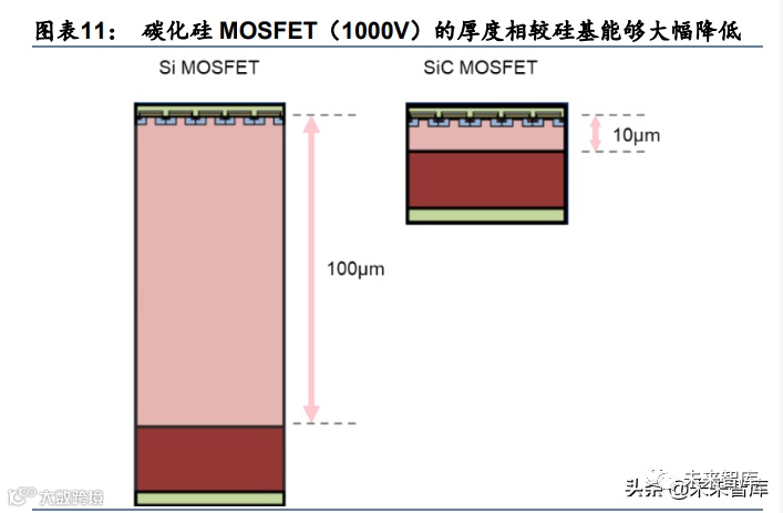 和成本。同时, SiC 材料较高的载流子迁移率使其能够提供更高电流密度,在相同功率等级中,碳化硅功率 模块的体积显著小于硅基模块,进一步助力新能源汽车实现轻量化。2)SiC MOSFET 器件 较硅基 IGBT 在开关损耗、导电损耗等方面具备显著优势,其在新能源汽车的应用可有效降 低损耗。根据丰田官网,丰田预测 SiC MOSFET 的应用有助于提升电动车的续航里程约 5%-10%。3)由于 SiC 材料具备更高的功率密度,所以同等功率下,SiC 器件的体积可以 缩小至 1/2 甚至更低;4)由于 SiC MOSFET 的高频特性,SiC 的应用能够显著减少电容、 电感等被动元件的应用,简化周边电路设计。