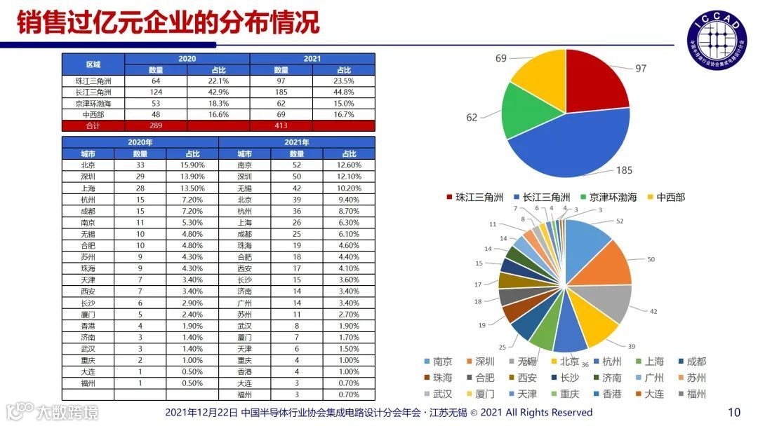 从销售额过亿元的芯片设计企业的城市分布来看,2020年只有11家销售过亿企业在南京,2021年跃居全国之首,拥有52家销售额过亿元的企业;深圳从去年的29家增长到今年的50家位居第二;无锡从10家增加到42家位居第三;北京从33家增长到39家;杭州从15家增加到36家;广州一14家销售额过亿元的企业首次纳入统计。