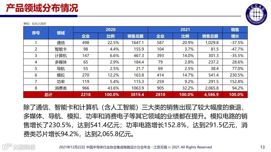 其中,模拟电路的销售增长了230.5%,达到541.4亿元;功率电路增长152.8%,达到291.5亿元,消费类芯片增长94.2%,达到2,065.8亿元。