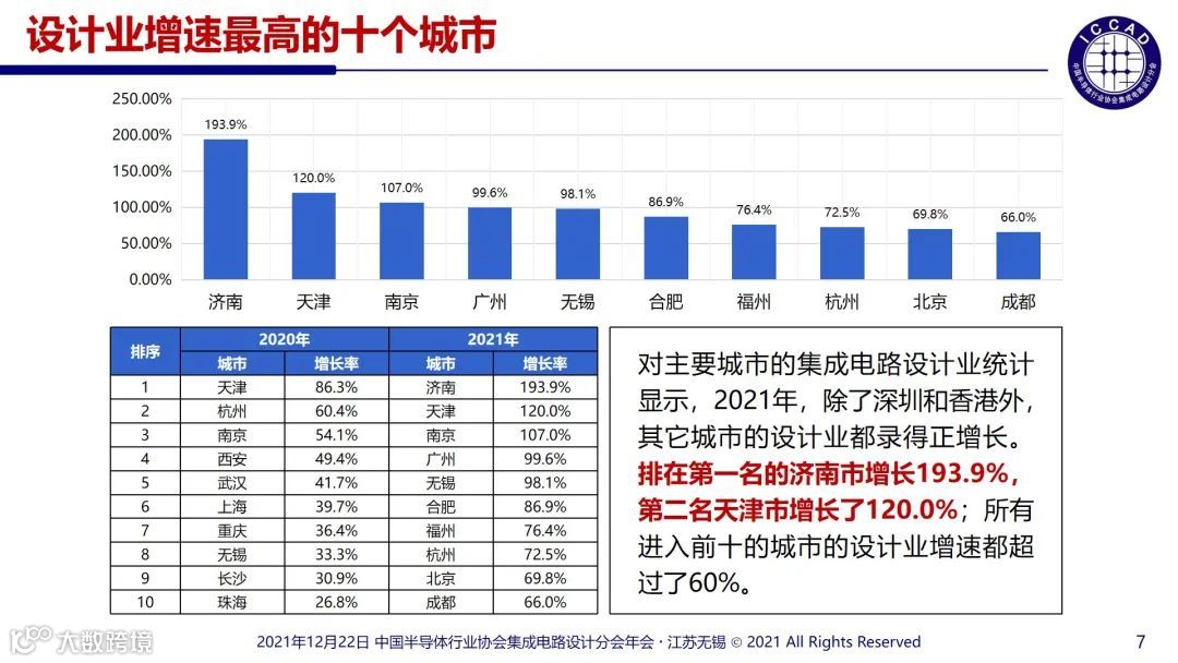 前十大芯片设计业城市的销售规模均超过了100亿元。10个城市的产业规