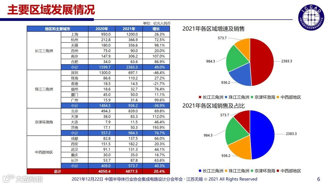 从主要的区域发展情况来看,由于2021年全球缺芯涨价情况的刺激,长三角洲地区2021年销售额达到了2383.3亿元,同比增长49.0%;京津环渤