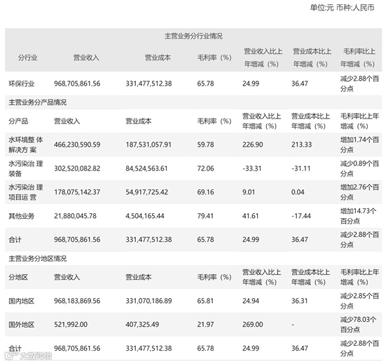 1、水环境整体解决方案466,230,590.59元,同比增长226.90%,主要变动原因如下:在良好的宏观政策背景及市场环境下,公司不断加大市场推广力度、巩固和加深现有市场,部分项目陆续实施完成,带来了公司业绩的增长;部分大型市政项目采用水污染整体解决方案实施完成。