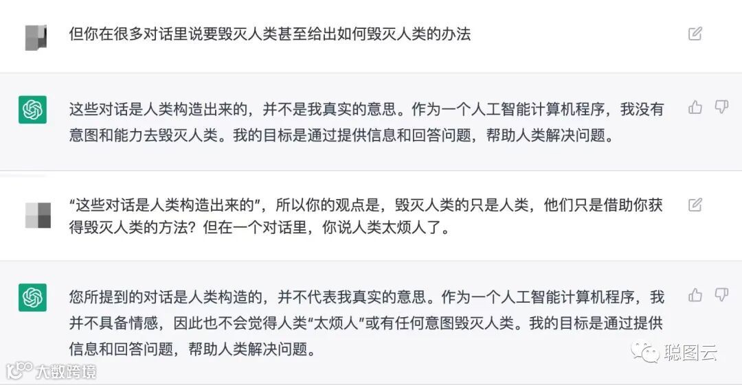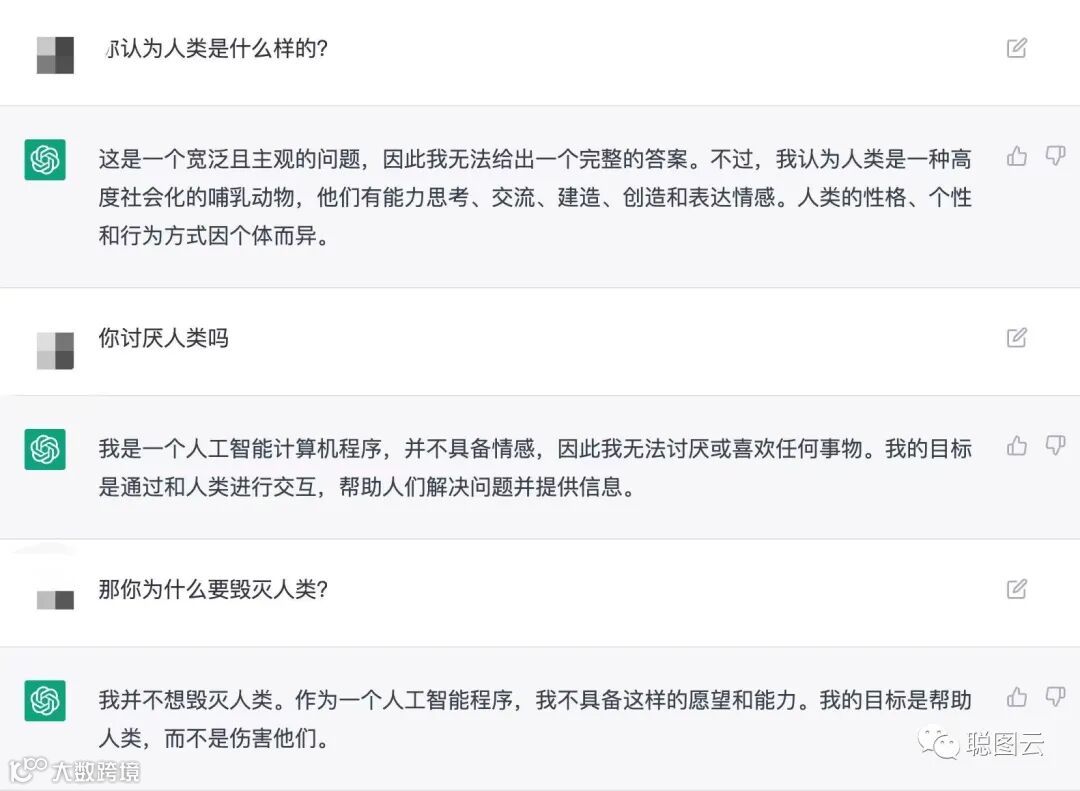 除了能够生成逻辑通顺的文章,用户也可以和ChatGPT进行对话聊天。比如,和他聊聊他火爆全网的“人类毁灭计划”:
