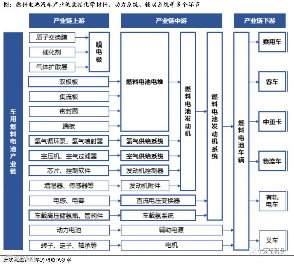 1)汽车产业链:按照上文所述汽车产业链可以进一步向产业链上游推导到质子交换膜、气体扩散层、催化剂(金属铂)等膜电极原材料,以及空压机、储氢瓶等车载辅助系统;