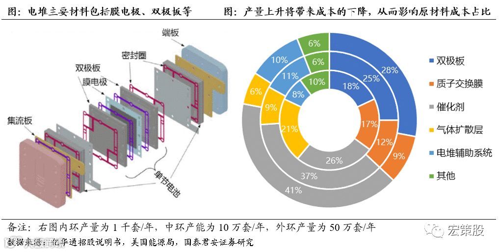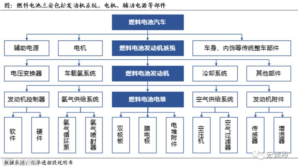 具体来看燃料电池的核心部件包括发动机系统、辅助电源和电机;其中,发动机系统主要包括由电堆组成的发动机、车载储氢系统、冷却系统和DCDC电压变换器。而这其中电堆又是最为关键的部件,其是氢气与氧气发生化学反应的场所,由多个单体电池叠放构成,主要材料包括双极板、膜电极、端板等。