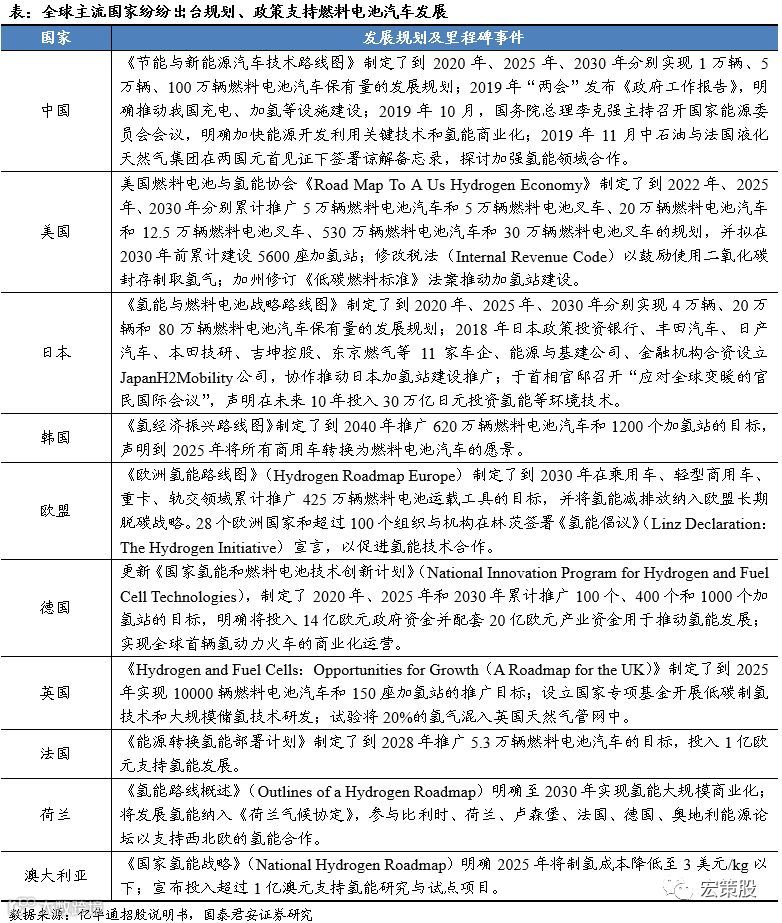 ■ 全球主流国家均发布燃料电池汽车相关规划,行业发展正当时。