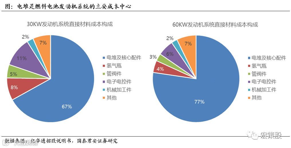 进一步细拆燃料电池发动机成本构成可以发现,电堆是其重要的成本中心,其直接材料占其发动机系统成本的90%左右,而电堆及其核心部件占其直接材料的成本比重约为70%左右。