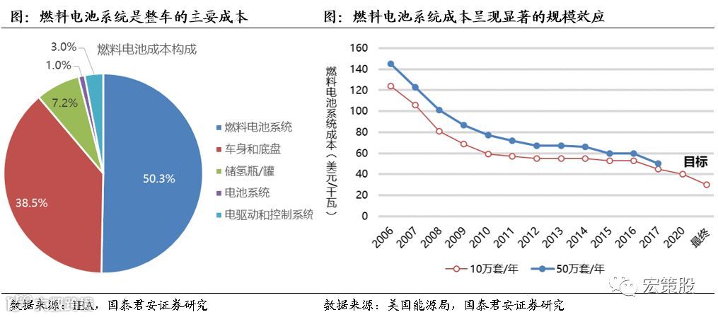 目前,燃料电池汽车成本中燃料电池系统占比超过一半;而根据的美国能源局2017年底发布的